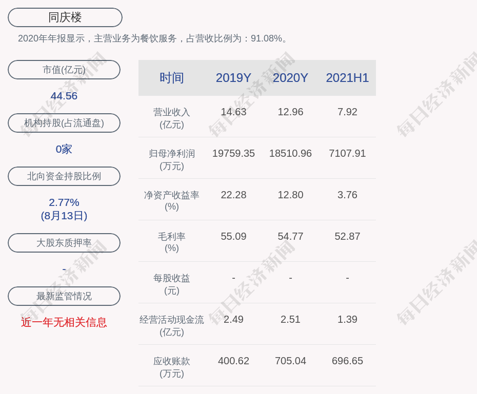 2020年年报显示,同庆楼的主营业务为餐饮服务,占营收比例为:91.08%。
