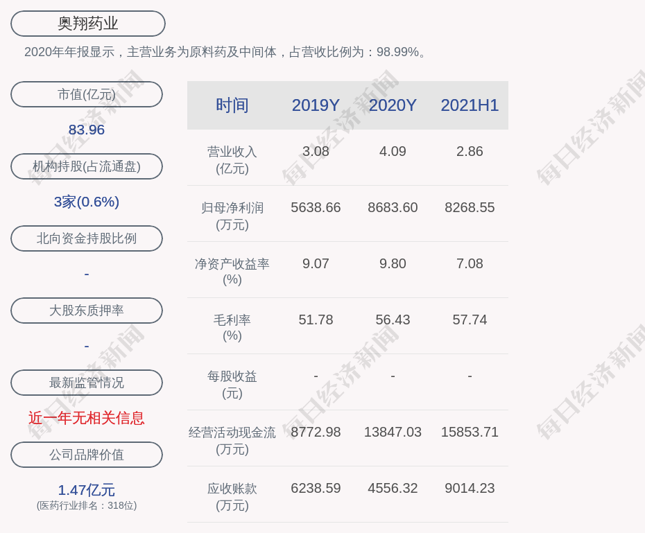 2020年年报显示,奥翔药业的主营业务为原料药及中间体。