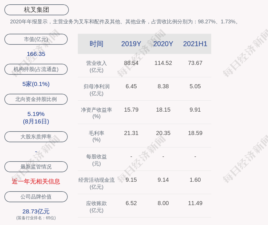 2020年年报显示,杭叉集团的主营业务为叉车和配件及其他、其他业务,占营收比例分别为:98.27%、1.73%。