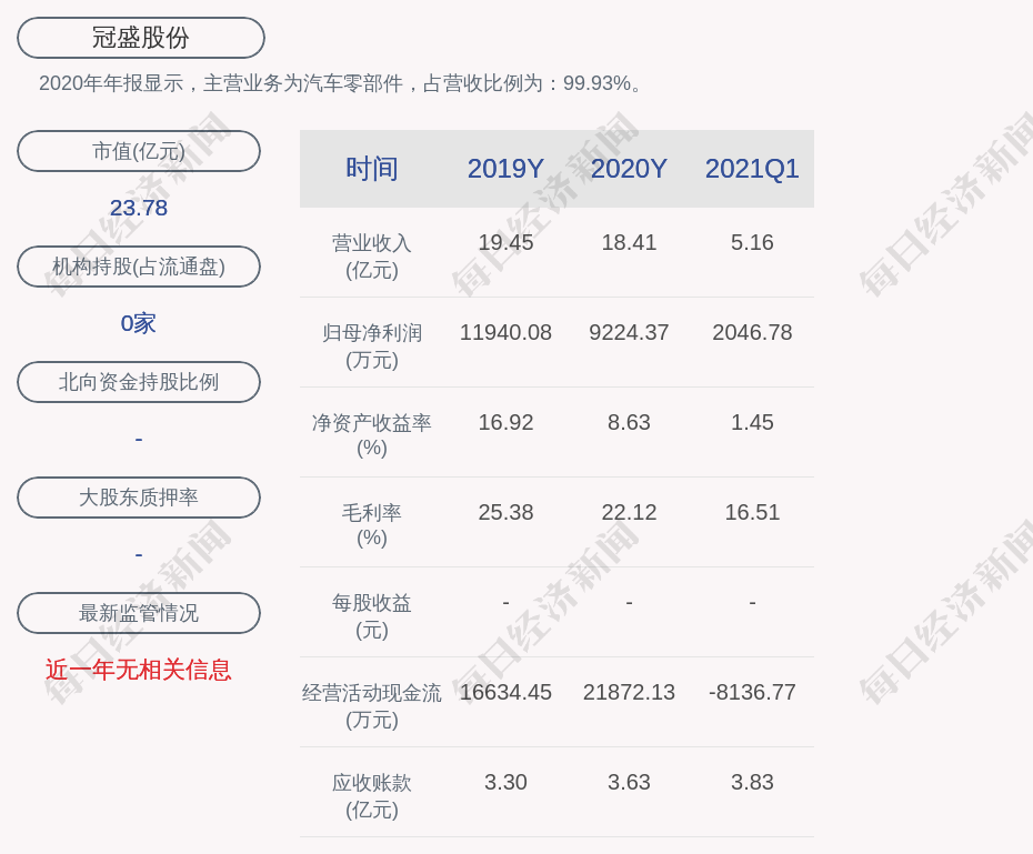 2020年年报显示,冠盛股份的主营业务为汽车零部件,占营收比例为:99.93%。