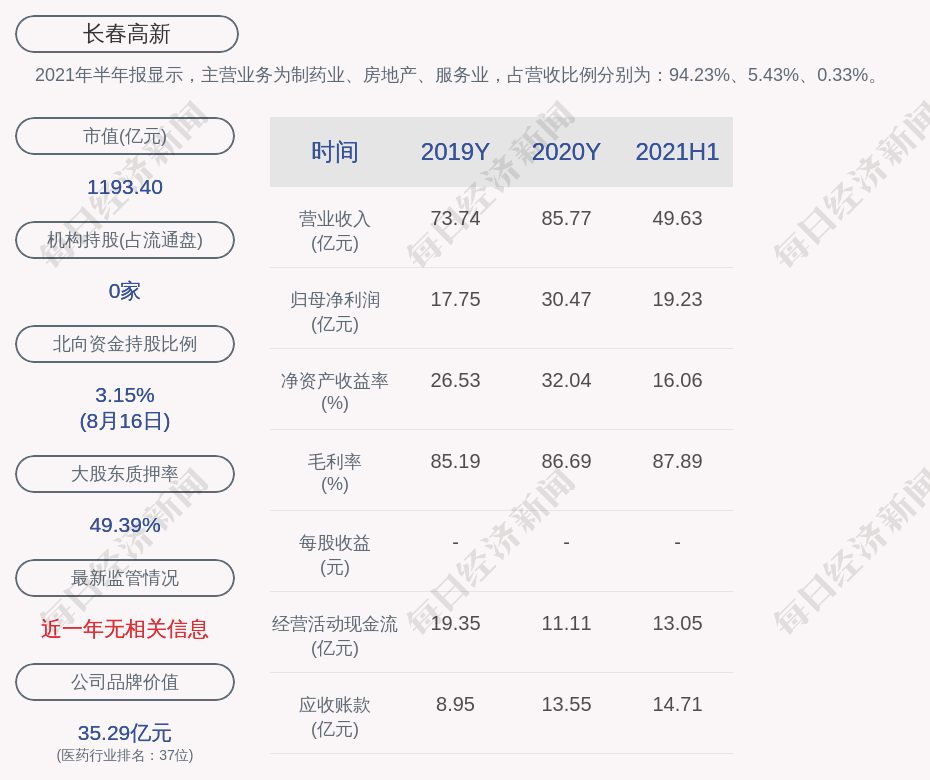 2021年半年报显示,长春高新的主营业务为制药业、房地产、服务业,占营收比例分别为:94.23%、5.43%、0.33%。