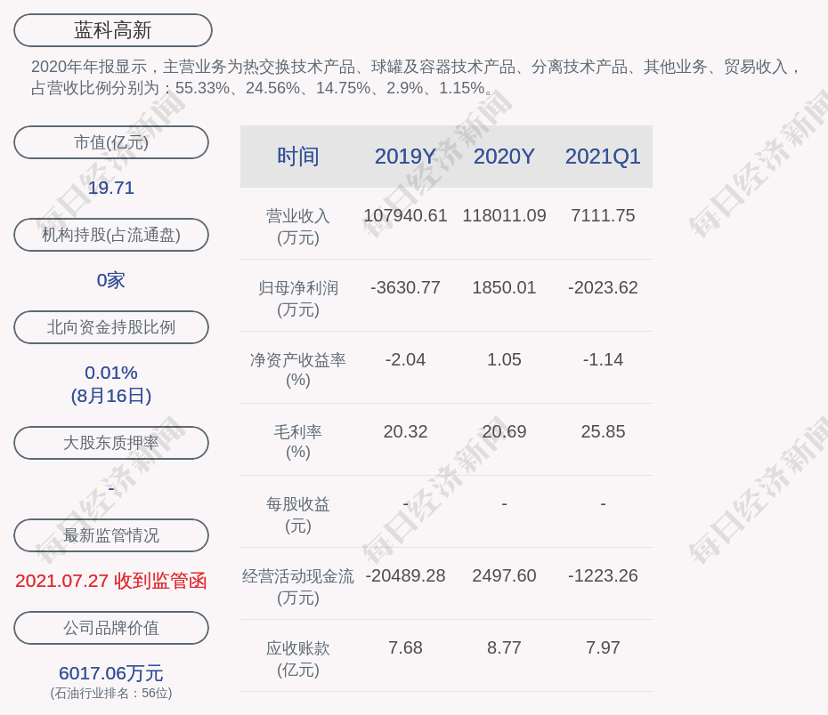 2020年年报显示,蓝科高新的主营业务为热交换技术产品、球罐及容器技术产品、分离技术产品、其他业务、贸易收入。