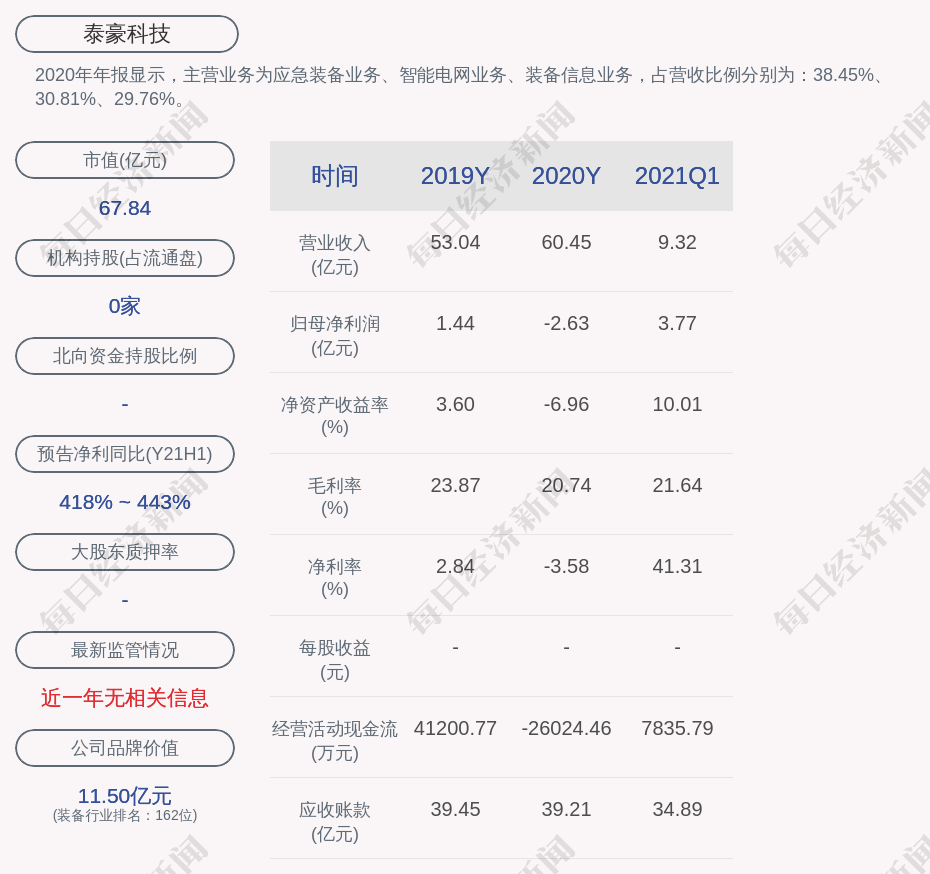 2020年年报显示,泰豪科技的主营业务为应急装备业务、智能电网业务、装备信息业务,占营收比例分别为:38.45%、30.81%、29.76%。