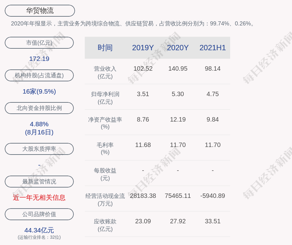 2020年年报显示,华贸物流的主营业务为跨境综合物流、供应链贸易,占营收比例分别为:99.74%、0.26%。