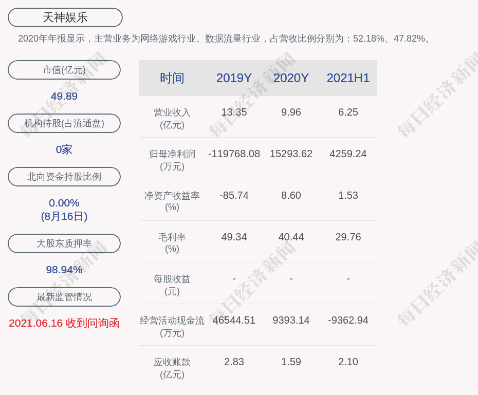 2020年年报显示,天神娱乐的主营业务为网络游戏行业、数据流量行业,占营收比例分别为:52.18%、47.82%。
