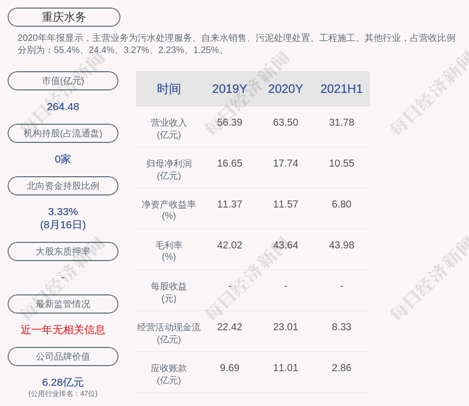 2020年年报显示,重庆水务的主营业务为污水处理服务、自来水销售、污泥处理处置、工程施工、其他行业。