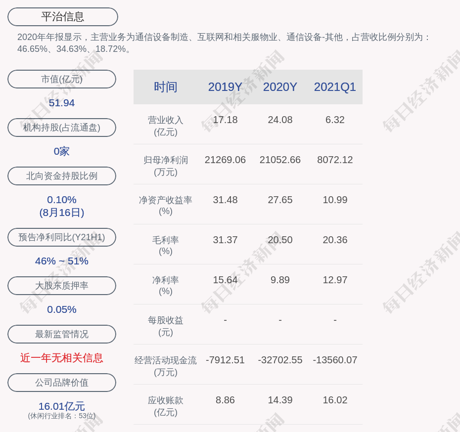 2020年年报显示,平治信息的主营业务为通信设备制造、互联网和相关服物业、通信设备-其他,占营收比例分别为:46.65%、34.63%、18.72%。