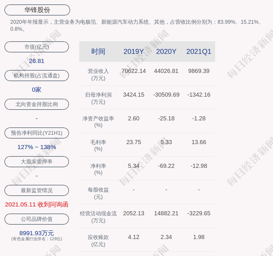 2020年年报显示,华锋股份的主营业务为电极箔、新能源汽车动力系统、其他,占营收比例分别为:83.99%、15.21%、0.8%。