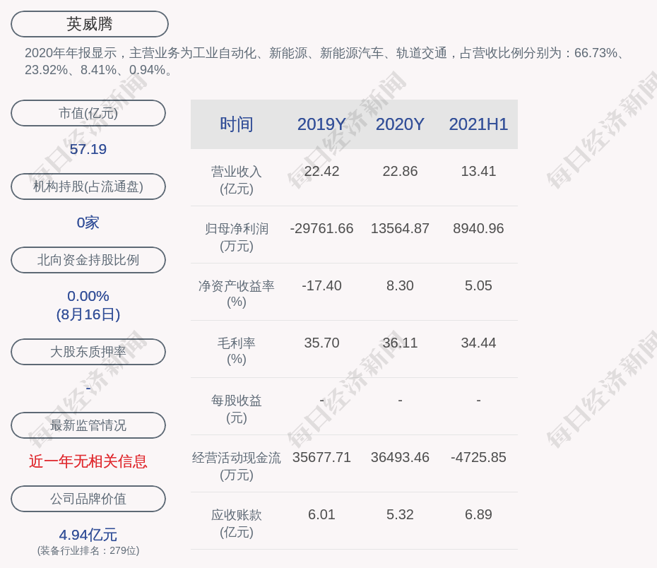 2020年年报显示,英威腾的主营业务为工业自动化、新能源、新能源汽车、轨道交通,占营收比例分别为:66.73%、23.92%、8.41%、0.94%。