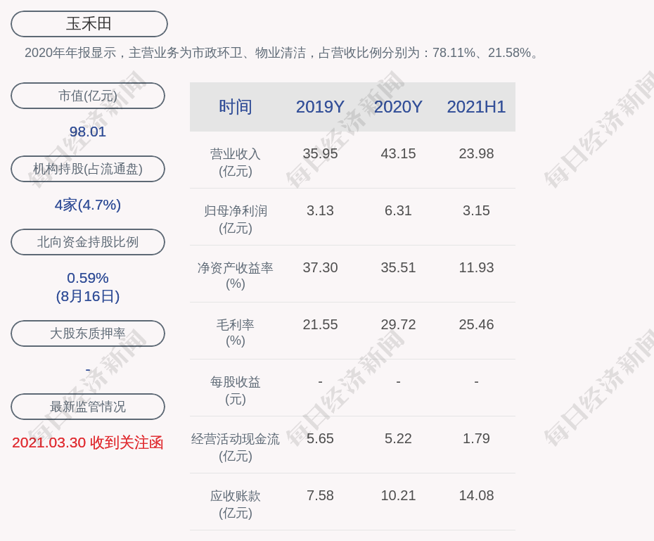 2020年年报显示,玉禾田的主营业务为市政环卫、物业清洁,占营收比例分别为:78.11%、21.58%。