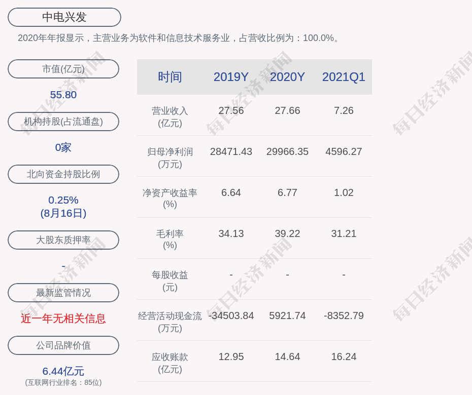 2020年年报显示,中电兴发的主营业务为软件和信息技术服务业,占营收比例为:100.0%。