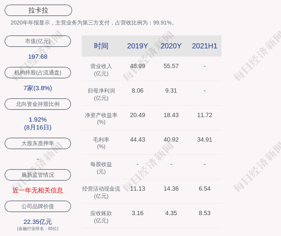 2020年年报显示,拉卡拉的主营业务为第三方支付,占营收比例为:99.91%。