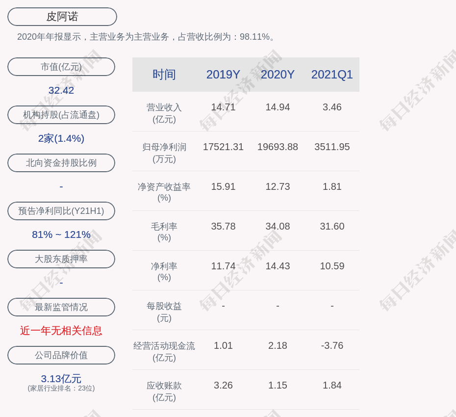 2020年年报显示,皮阿诺的主营业务为主营业务,占营收比例为:98.11%。