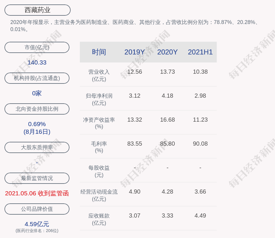 2020年年报显示,西藏药业的主营业务为医药制造业、医药商业、其他行业,占营收比例分别为:78.87%、20.28%、0.01%。