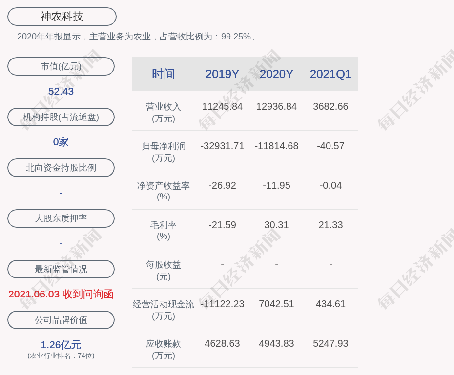 2020年年报显示,神农科技的主营业务为农业,占营收比例为:99.25%。