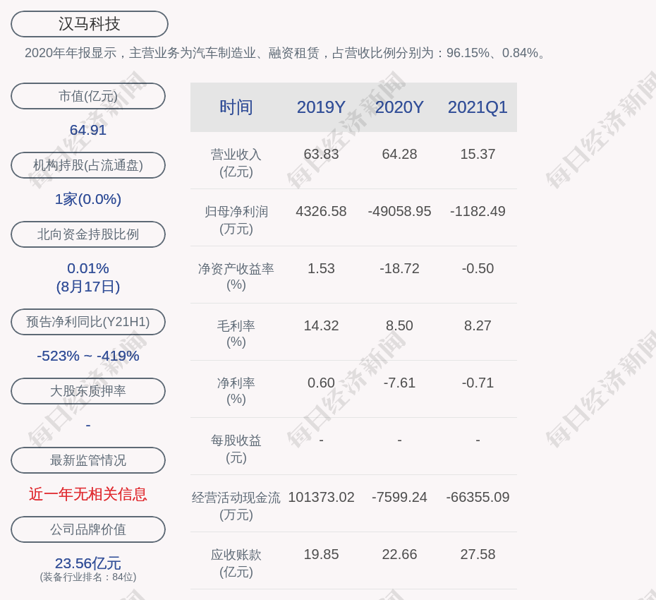 2020年年报显示,汉马科技的主营业务为汽车制造业、融资租赁,占营收比例分别为:96.15%、0.84%。