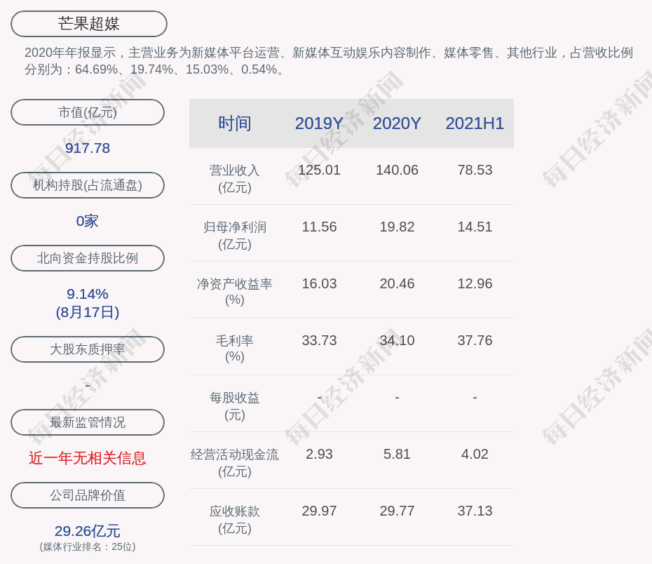 2020年年报显示,芒果超媒的主营业务为新媒体平台运营、新媒体互动娱乐内容制作、媒体零售、其他行业,占营收比例分别为:64.69%、19.74%、15.03%、0.54%。
