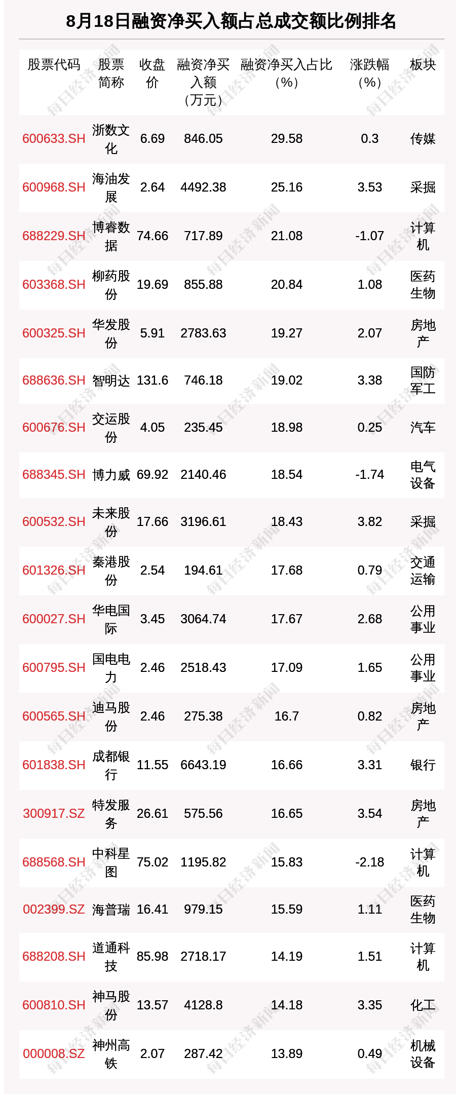 8月18日两市共有941只个股有融资资金净买入。共有49只股票融资净买入额占总成交金额比例超10%,其中浙数文化、海油发展、博睿数据排名前三,占比分别为29.58%、25.16%、21.08%。