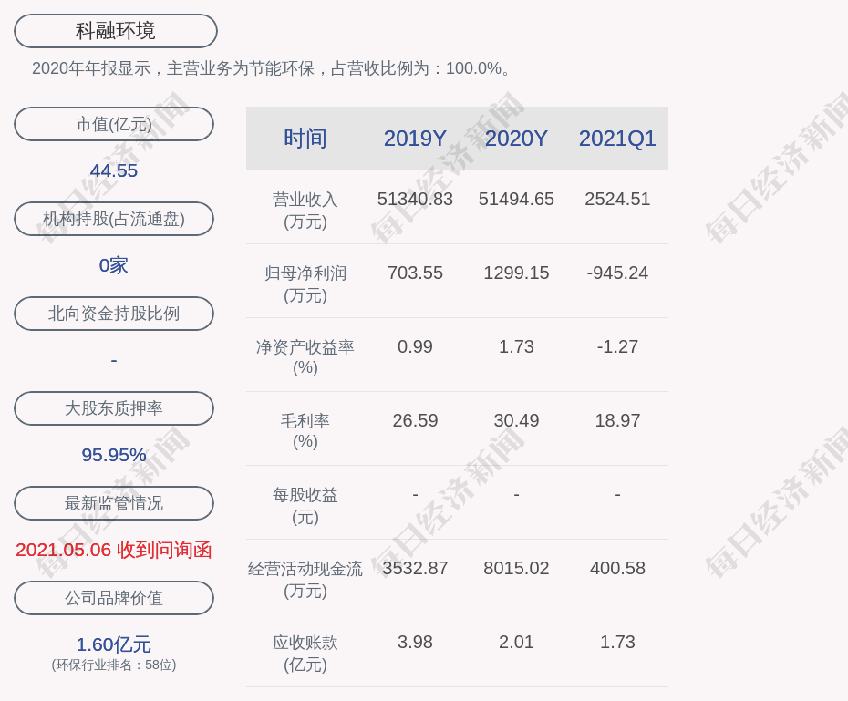 2020年年报显示,科融环境的主营业务为节能环保,占营收比例为:100.0%。