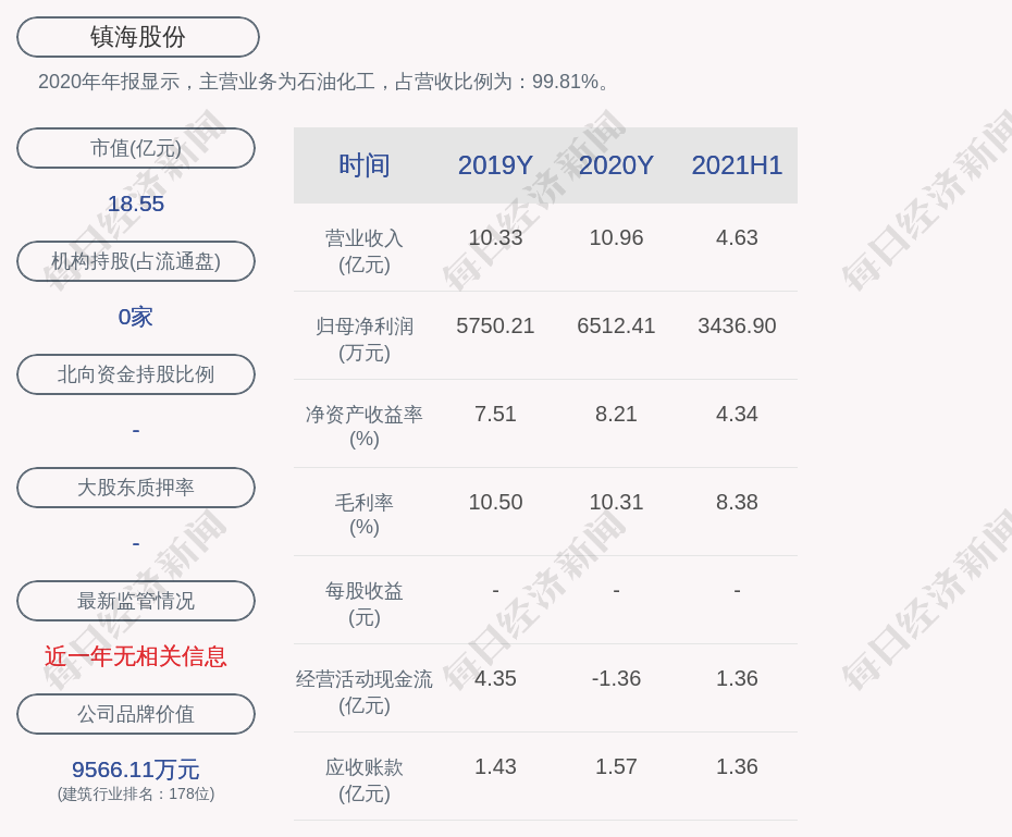 2020年年报显示,镇海股份的主营业务为石油化工,占营收比例为:99.81%。