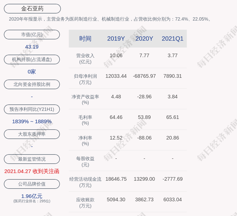 2020年年报显示,金石亚药的主营业务为医药制造行业、机械制造行业,占营收比例分别为:72.4%、22.05%。
