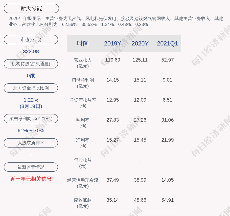 2020年年报显示,新天绿能的主营业务为天然气、风电和光伏发电、接驳及建设燃气管网收入、其他主营业务收入、其他业务,占营收比例分别为:62.56%、35.53%、1.24%、0.43%、0.23%。