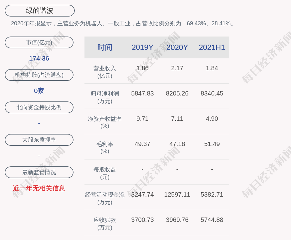 2020年年报显示,绿的谐波的主营业务为机器人、一般工业,占营收比例分别为:69.43%、28.41%。