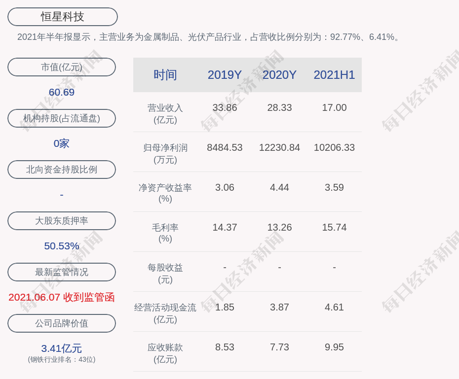 2021年半年报显示,恒星科技的主营业务为金属制品、光伏产品行业,占营收比例分别为:92.77%、6.41%。