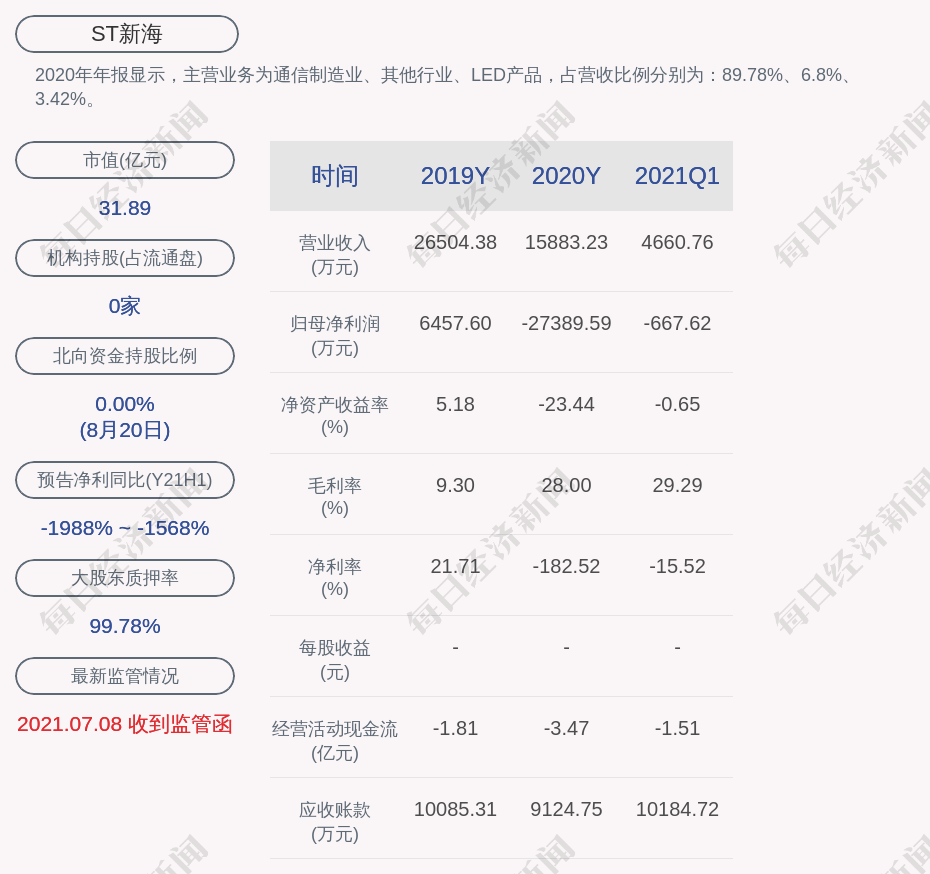 2020年年报显示,ST新海的主营业务为通信制造业、其他行业、LED产品,占营收比例分别为:89.78%、6.8%、3.42%。