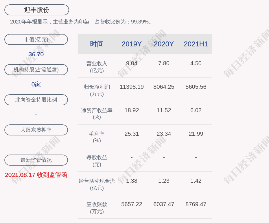 2020年年报显示,迎丰股份的主营业务为印染,占营收比例为:99.89%。