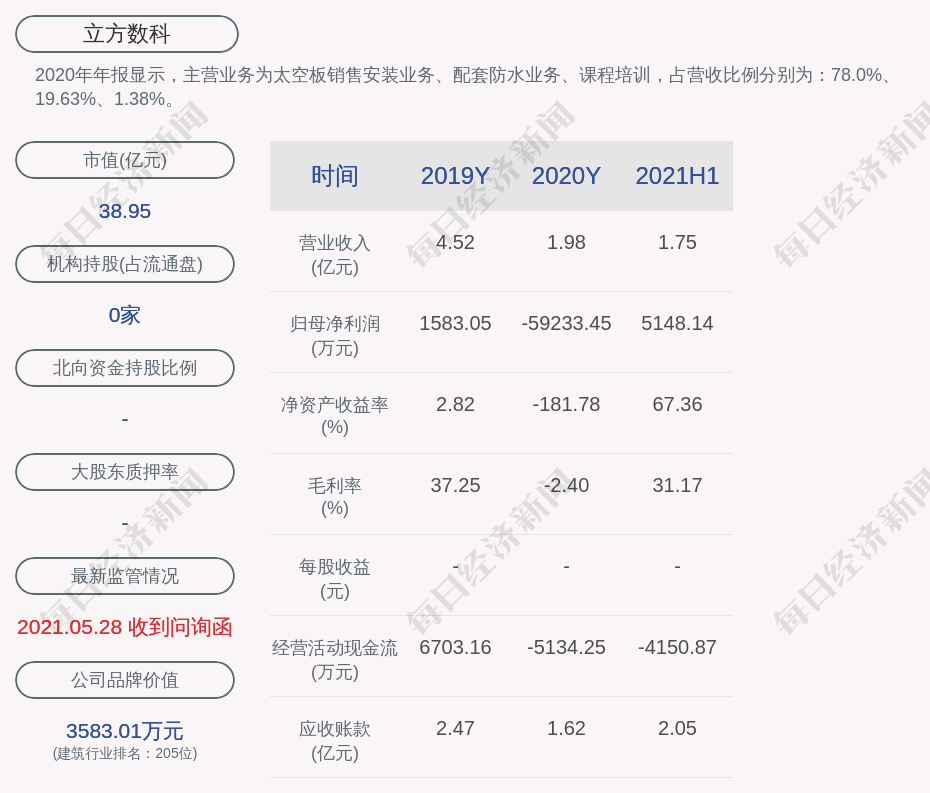 2020年年报显示,立方数科的主营业务为太空板销售安装业务、配套防水业务、课程培训,占营收比例分别为:78.0%、19.63%、1.38%。