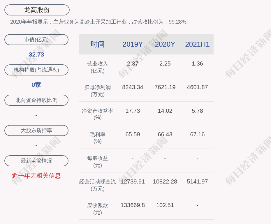 2020年年报显示,龙高股份的主营业务为高岭土开采加工行业。
