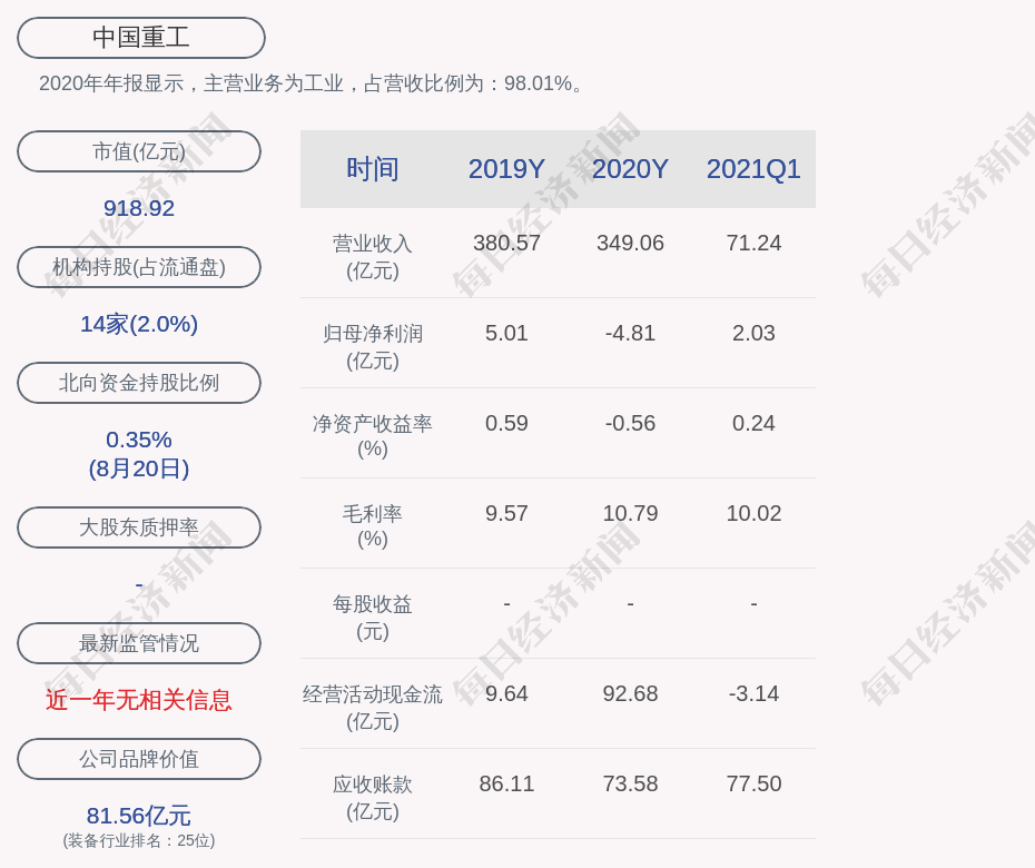 2020年年报显示,中国重工的主营业务为工业,占营收比例为:98.01%。