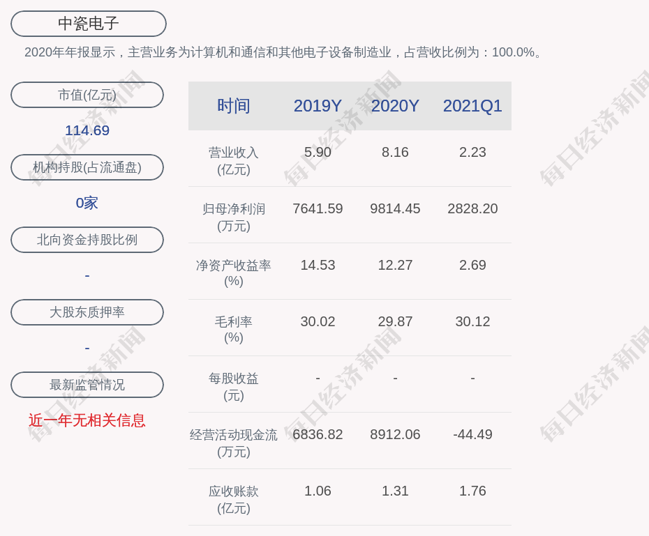 2020年年报显示,中瓷电子的主营业务为计算机和通信和其他电子设备制造业,占营收比例为:100.0%。