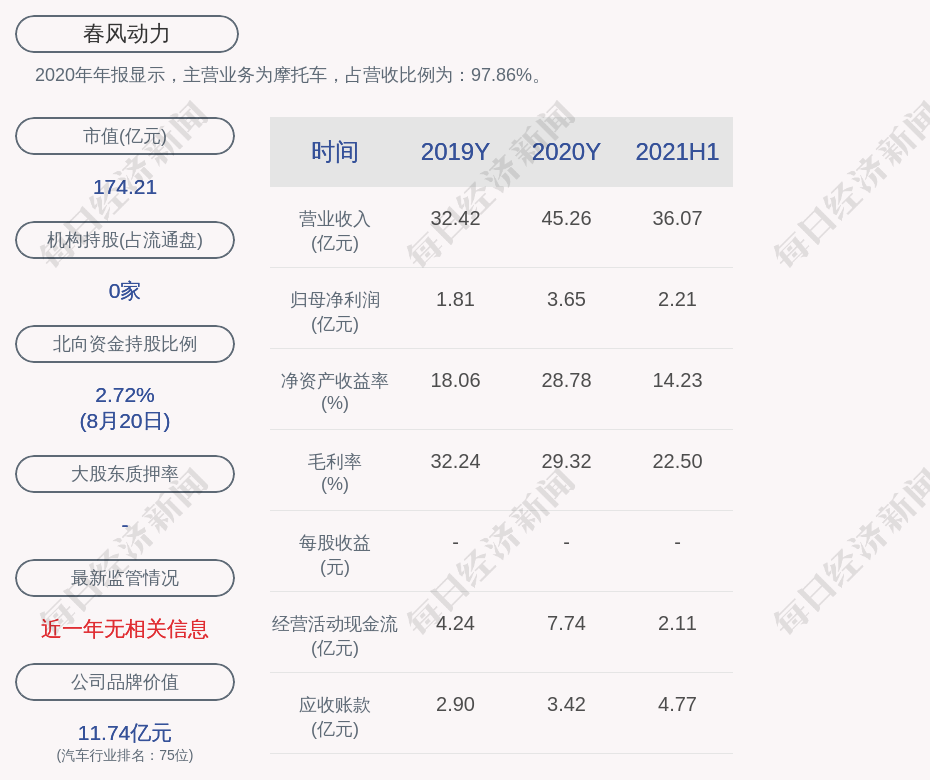 2020年年报显示,春风动力的主营业务为摩托车,占营收比例为:97.86%。