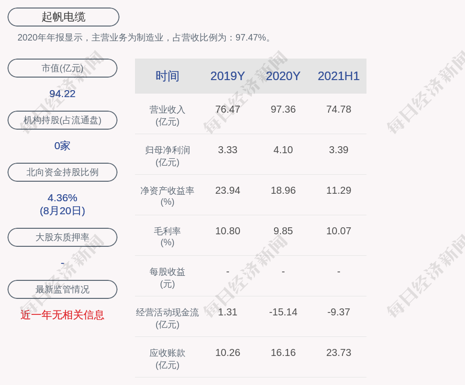 2020年年报显示,起帆电缆的主营业务为制造业,占营收比例为:97.47%。