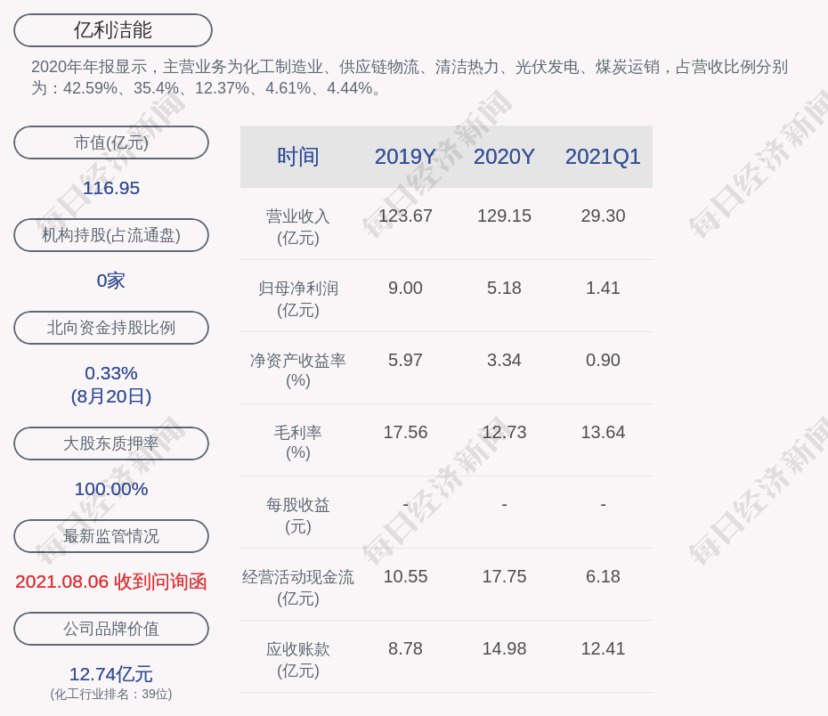 2020年年报显示,亿利洁能的主营业务为化工制造业、供应链物流、清洁热力、光伏发电、煤炭运销,占营收比例分别为:42.59%、35.4%、12.37%、4.61%、4.44%。
