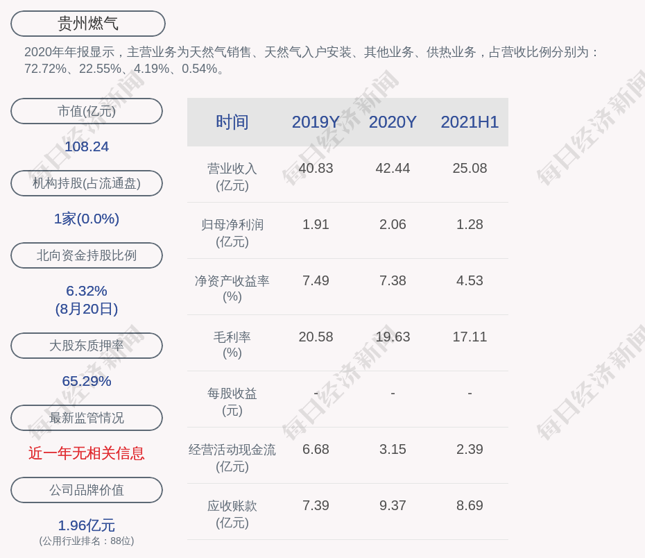 2020年年报显示,贵州燃气的主营业务为天然气销售、天然气入户安装、其他业务、供热业务,占营收比例分别为:72.72%、22.55%、4.19%、0.54%。