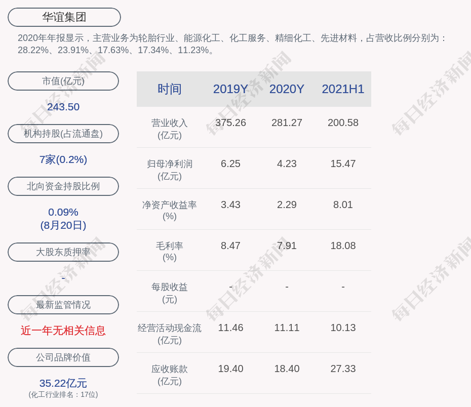 2020年年报显示,华谊集团的主营业务为轮胎行业、能源化工、化工服务、精细化工、先进材料,占营收比例分别为:28.22%、23.91%、17.63%、17.34%、11.23%。