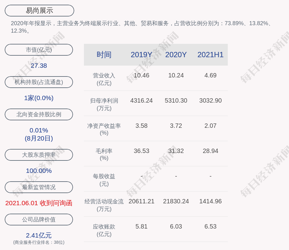 2020年年报显示,易尚展示的主营业务为终端展示行业、其他、贸易和服务,占营收比例分别为:73.89%、13.82%、12.3%。
