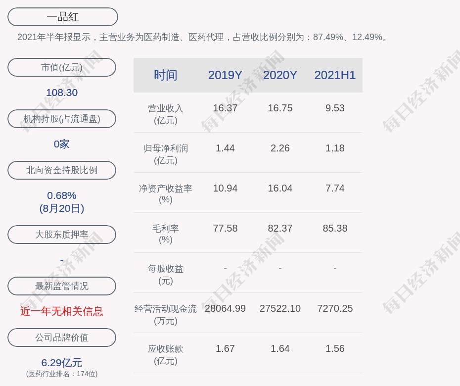 2021年半年报显示,一品红的主营业务为医药制造、医药代理,占营收比例分别为:87.49%、12.49%。