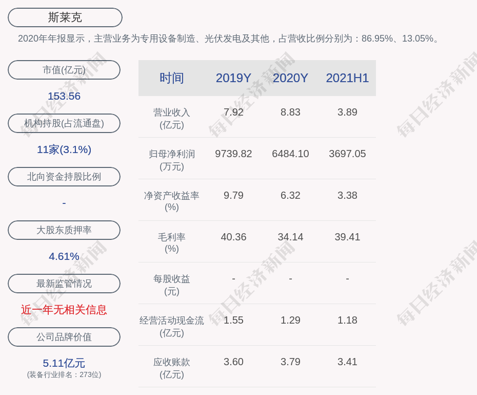 2020年年报显示,斯莱克的主营业务为专用设备制造、光伏发电及其他,占营收比例分别为:86.95%、13.05%。