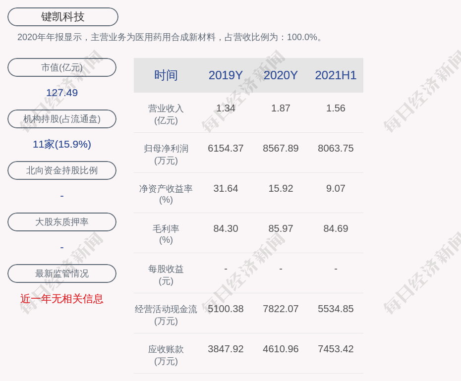 2020年年报显示,键凯科技的主营业务为医用药用合成新材料,占营收比例为:100.0%。