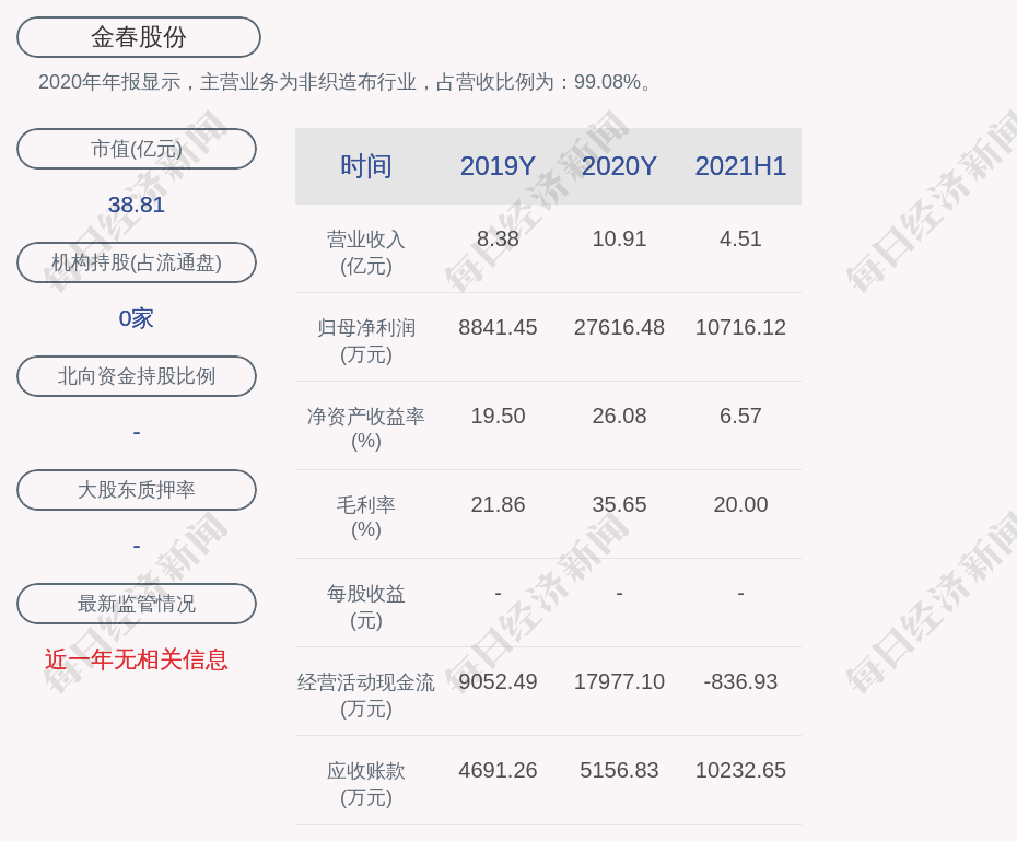 2020年年报显示,金春股份的主营业务为非织造布行业,占营收比例为:99.08%。