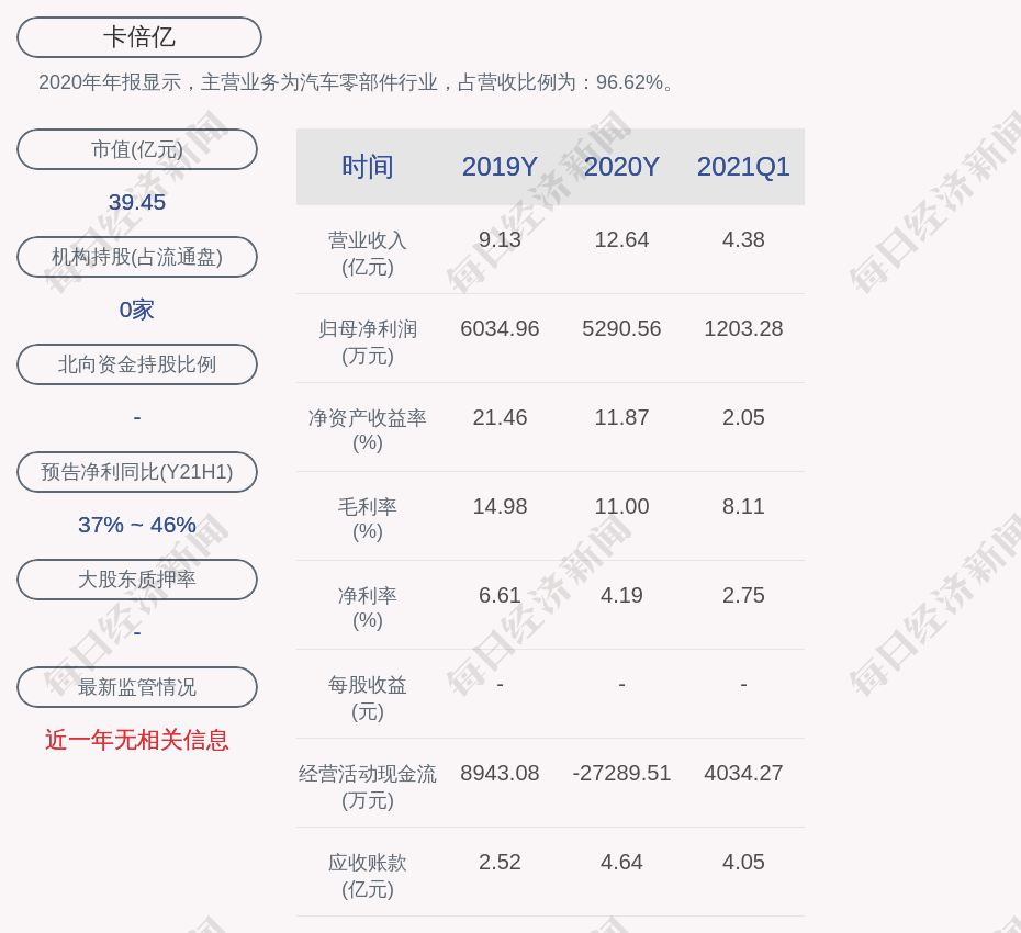 2020年年报显示,卡倍亿的主营业务为汽车零部件行业,占营收比例为:96.62%。
