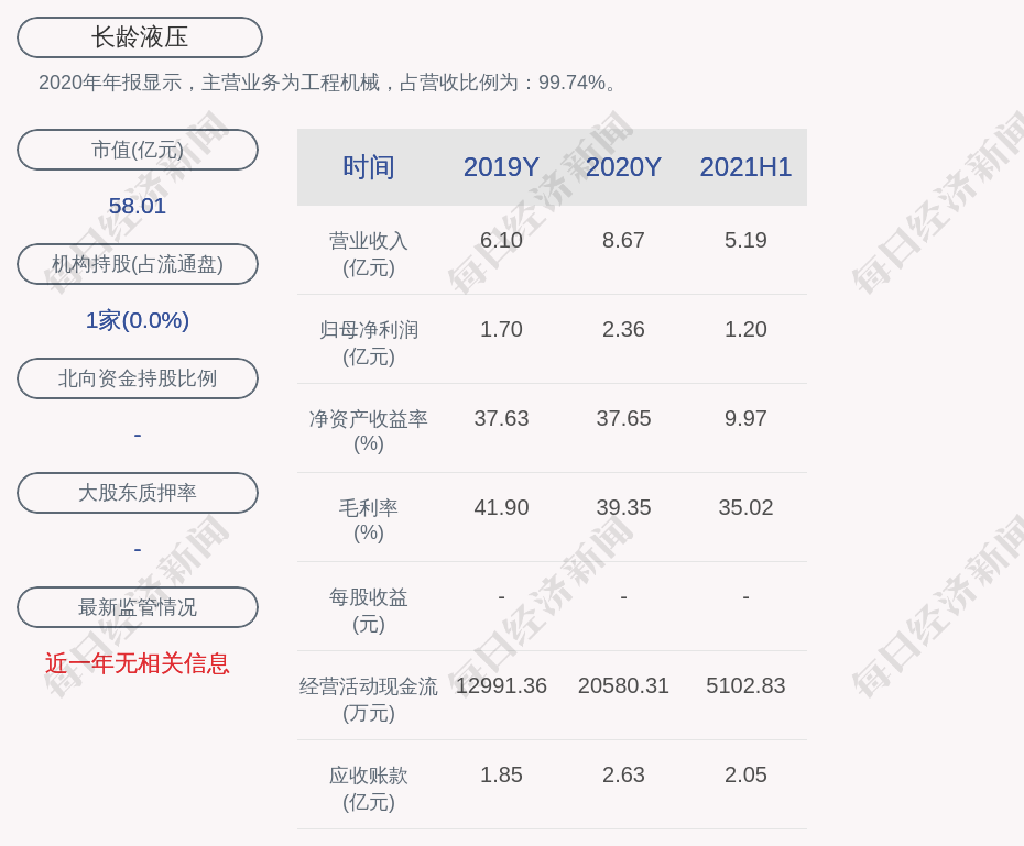 2020年年报显示,长龄液压的主营业务为工程机械,占营收比例为:99.74%。