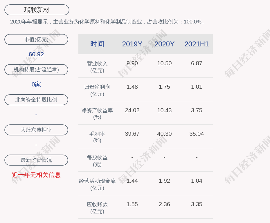 2020年年报显示,瑞联新材的主营业务为化学原料和化学制品制造业,占营收比例为:100.0%。