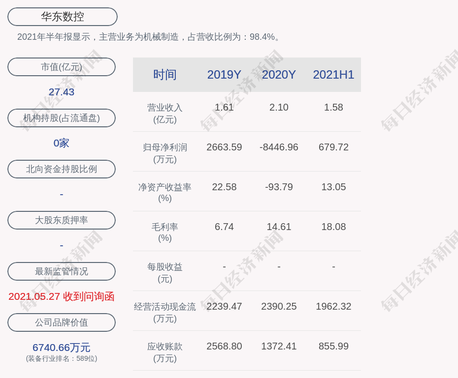 2021年半年报显示,华东数控的主营业务为机械制造,占营收比例为:98.4%。