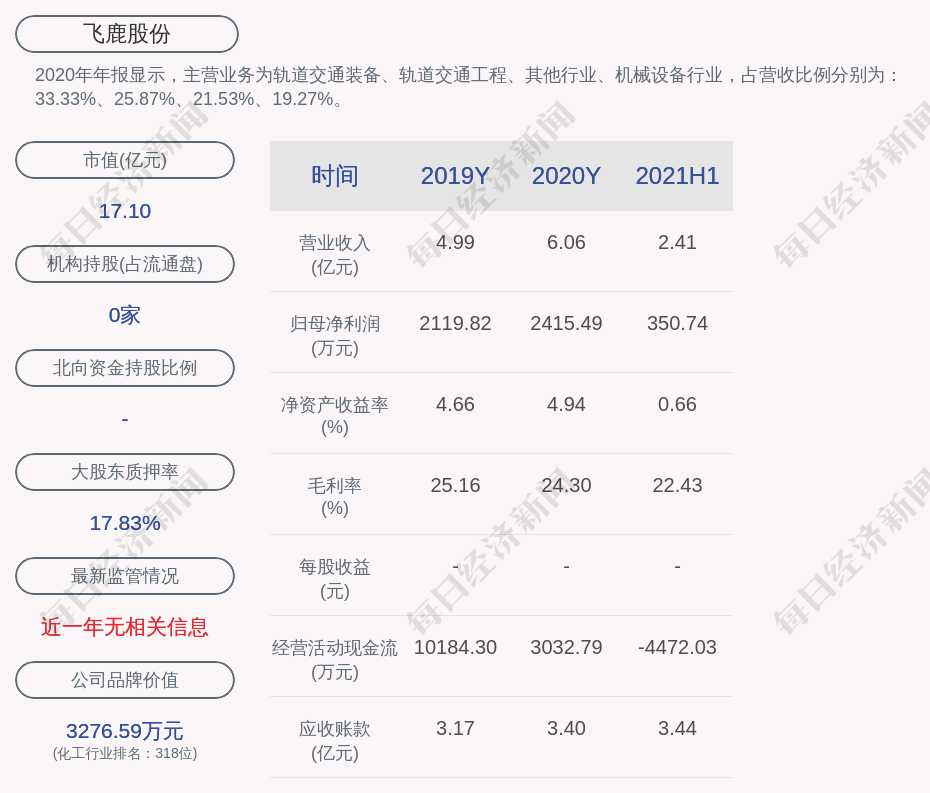 2020年年报显示,飞鹿股份的主营业务为轨道交通装备、轨道交通工程、其他行业、机械设备行业。