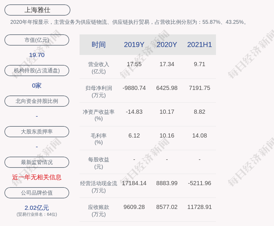 2020年年报显示,上海雅仕的主营业务为供应链物流、供应链执行贸易,占营收比例分别为:55.87%、43.25%。